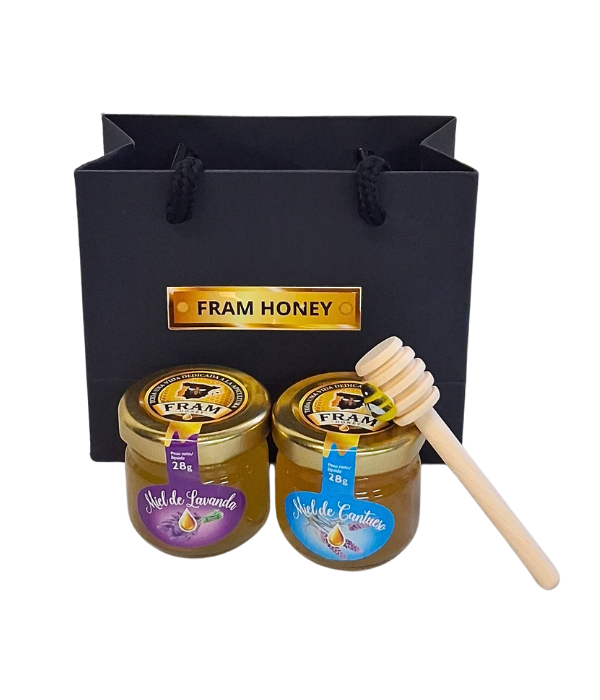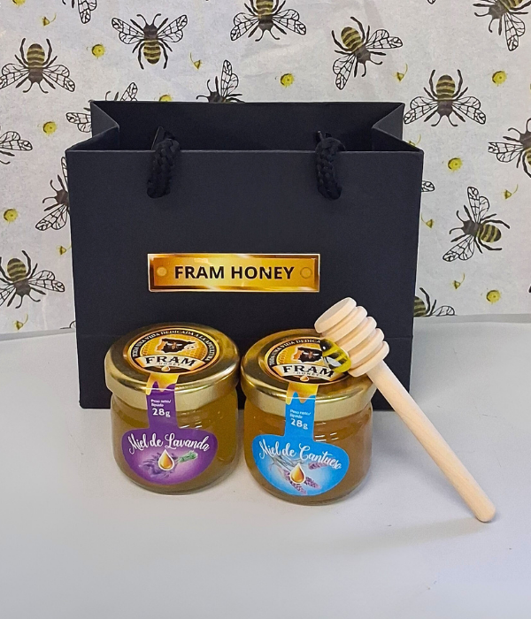 Bolsa regalo con una pequeña selección de mieles artesanales Fram Honey, presentada en una elegante bolsa ideal para regalar.
