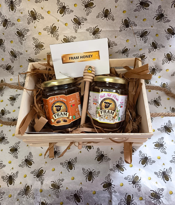 Caja regalo con una selección de mieles artesanales Fram Honey.
